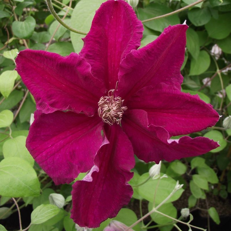 Clematis Rouge Cardinal este o planta urcatoare decorativa care face parte din familia Ranunculaceae. Creste usor si se ramifica puternic. Frunzele cresc sub forma ovala in nuante de verde crud. Florile sunt mari, deschise formate din 6 petale in nuante de rosu-visiniu intens si cu interiorul alb. Petalele au aspect catifelat.